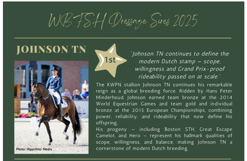 På ranglisten over de mest succesfulde faderhingste er det KWPN-hingsten Johnson TN e. Jazz/Flemmingh som topper listen. Hingsten selv har været succesfuld på Grand Prix-niveau under Hans Peter Minderhoud, hvor de bandt bronze ved WEG i 2014 samt hold guld og individuel bronze ved EM i 2015.