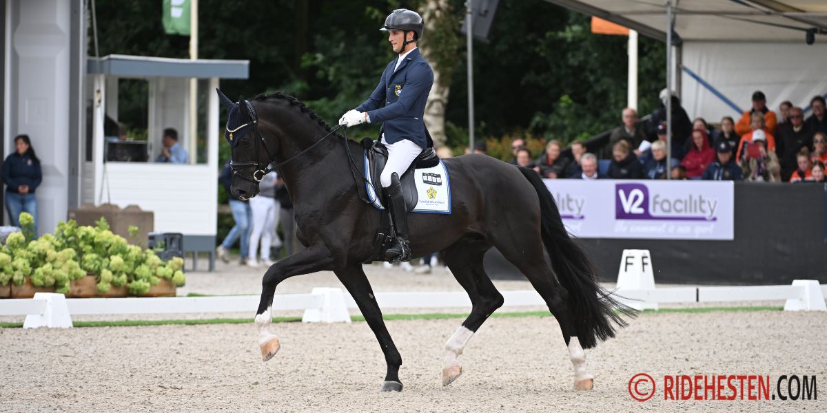 Vi har haft fornøjelsen af at følge Carl Hedin ved Dansk Varmblods Hingstekåring i 2024, hvor han var til start med Play-Off st. Chyvan. Foto: Ridehesten.com