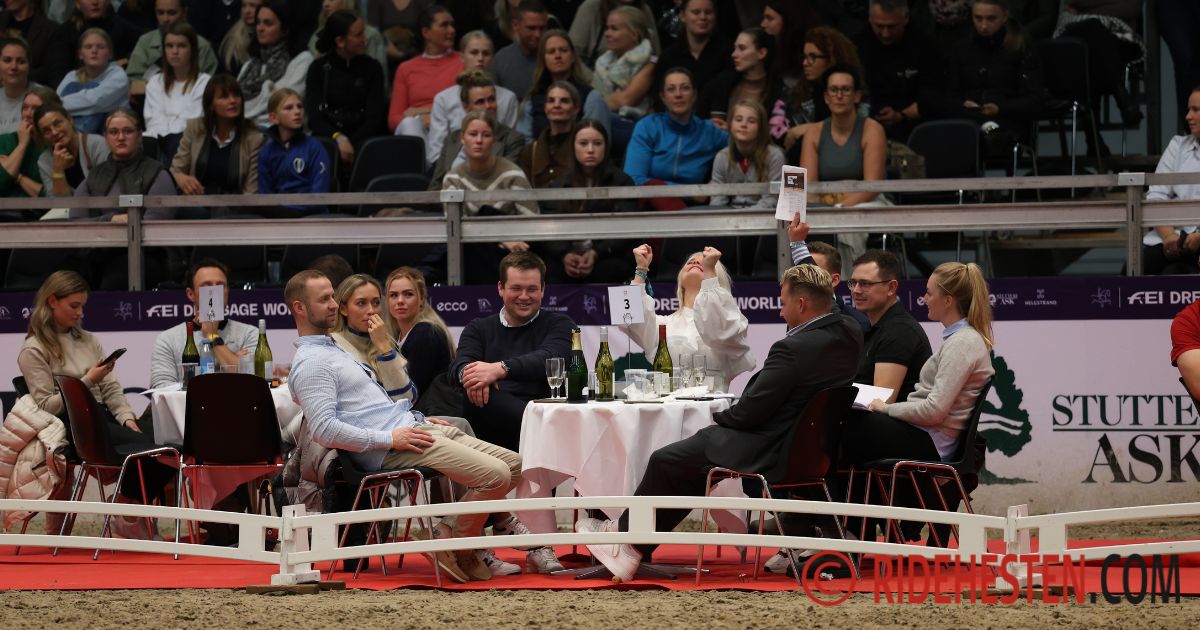 Der var en rigtig god stemning i hallen, og ved vip-bordene tæt på ringside. Budduellerne bølgede, og ved et af borde havde Anders Yde og Nicklas Toelstang slået sig sammen om at byde på flere føl. Følelserne gik højt ved bordet, når de blev overbudt, men et føl fik de handlet hjem, Hakuna Matata LBH e. Blue Hors St. Schufro/Blue Hors Hotline til en hammerslagspris på 13.000 euro.