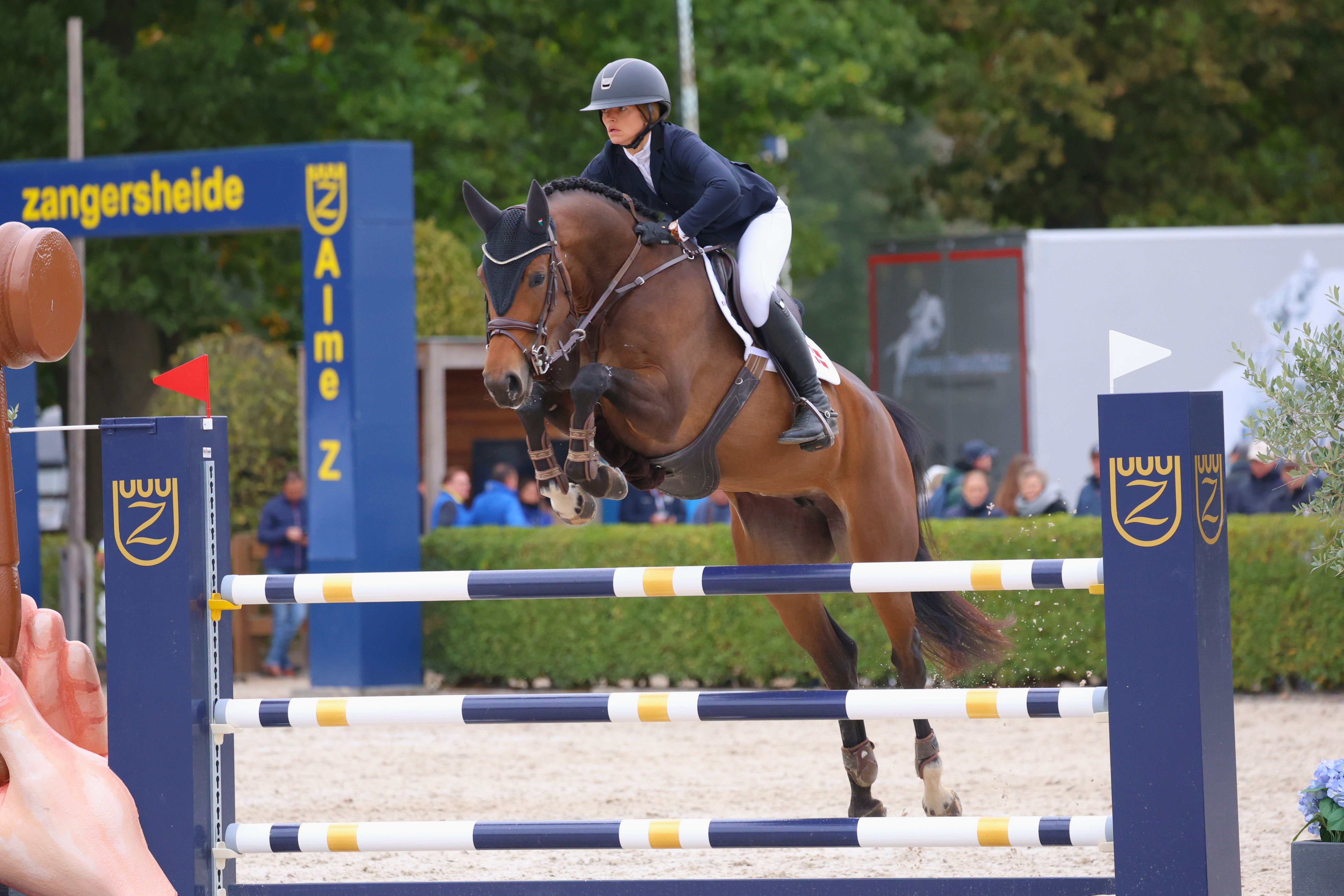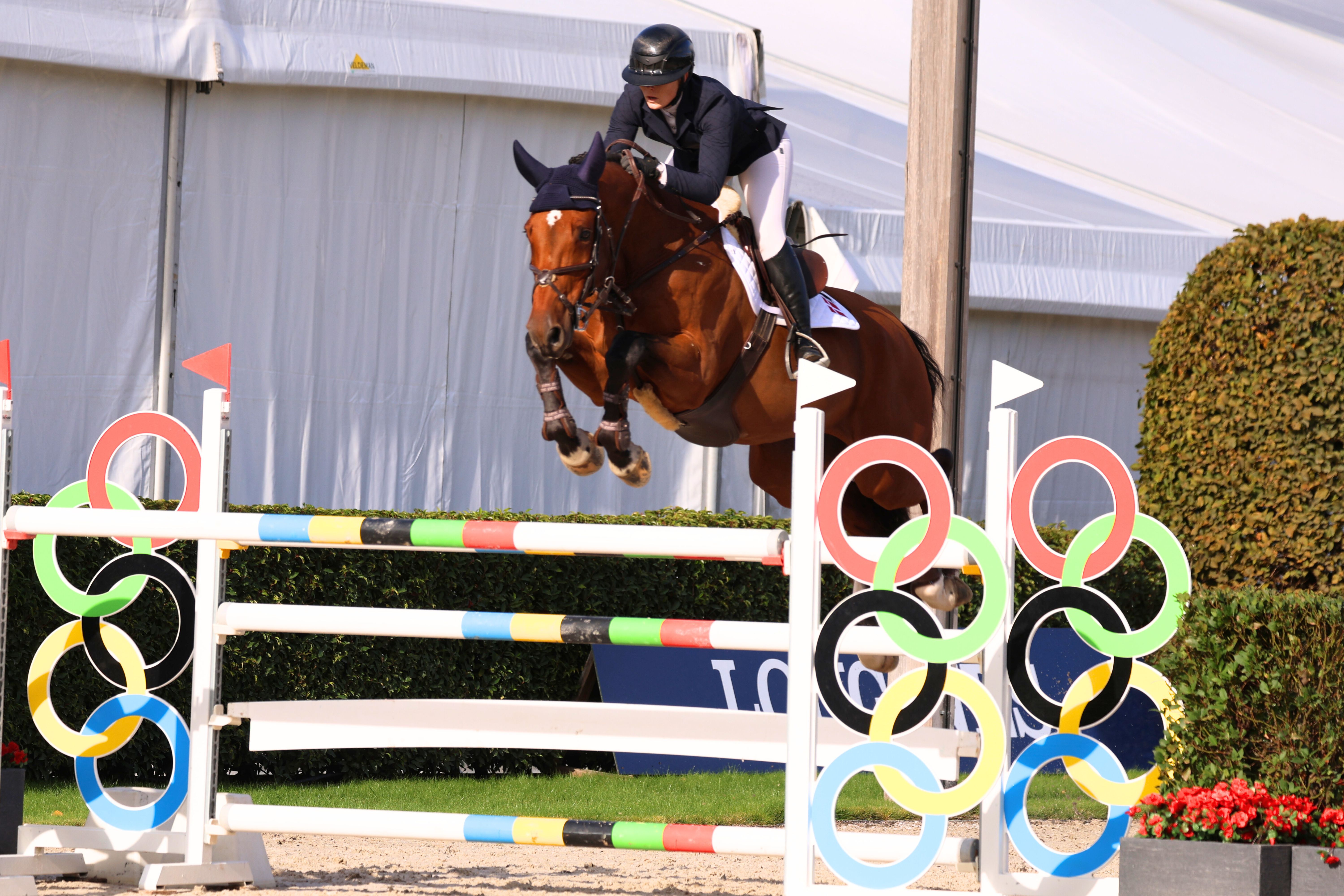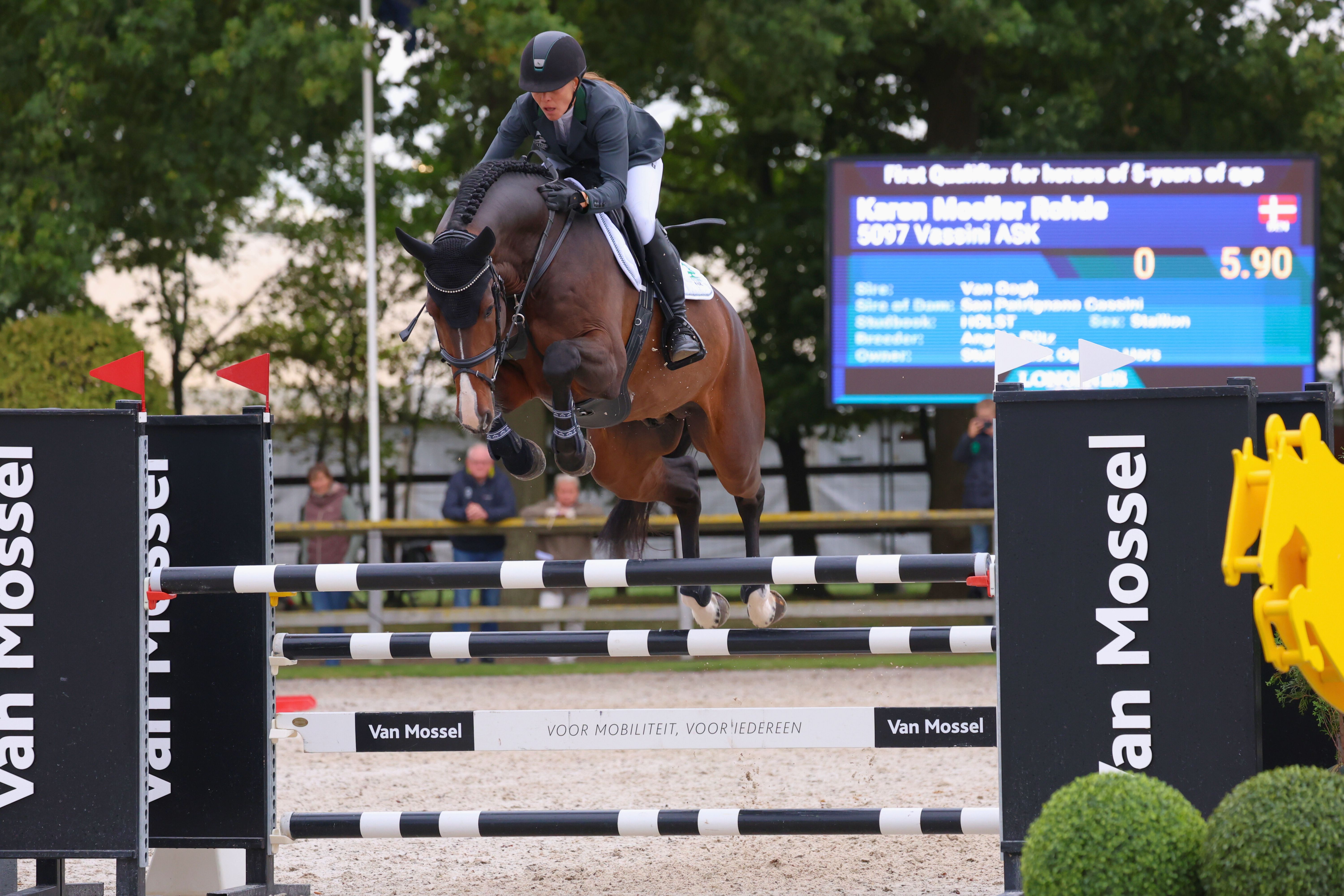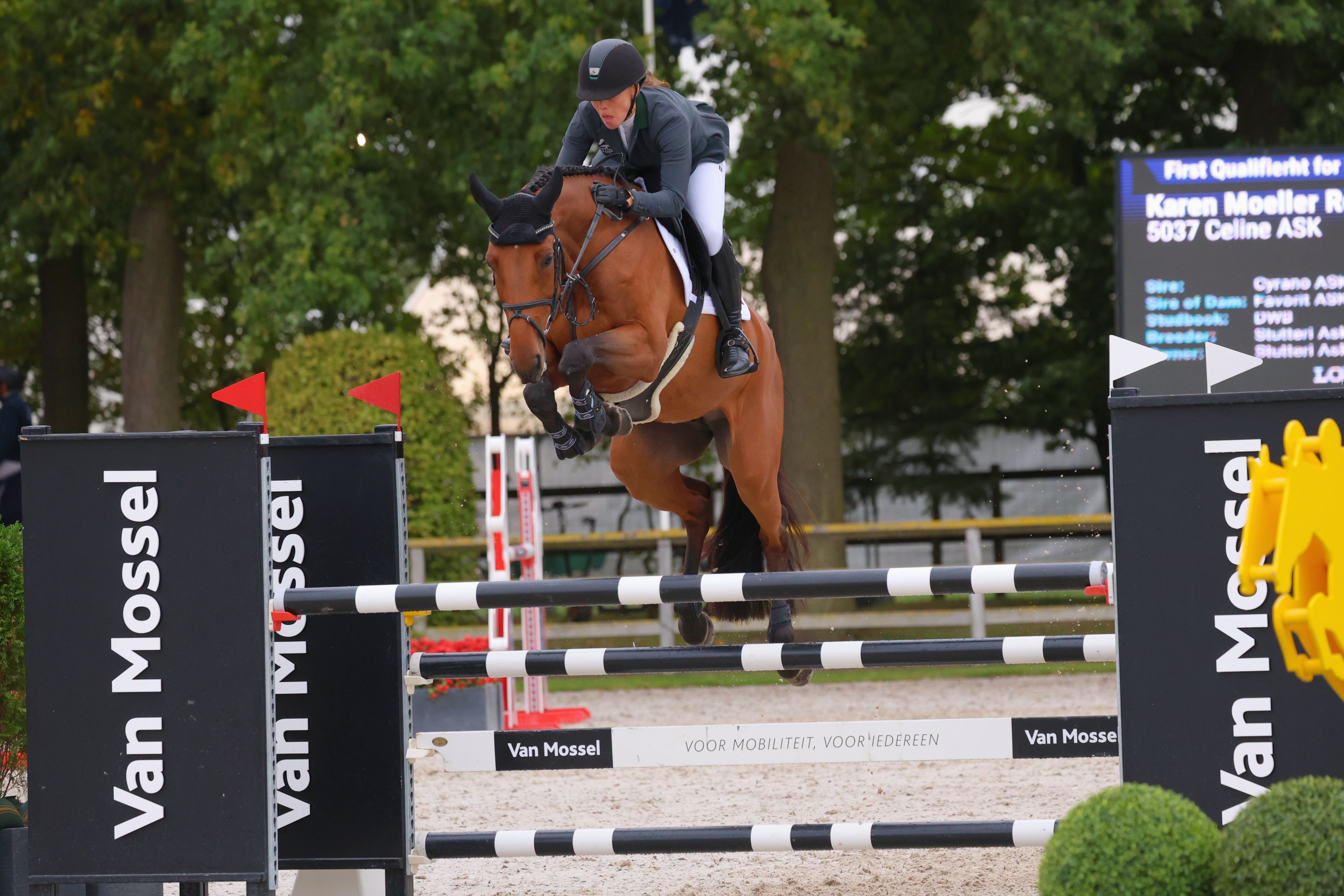 | HARMILLY D 208333DW1900168 Rytter: Maria Hjorth Frederiksen 1. kval. 4 fejl 2. kval. 0 fejl Ejer: Liselotte Frederiksen Opdrætter: Liselotte Frederiksen F: HARLEY VDL M: DUBLÉ RDH MF: DIAMANT DE SEMILLY