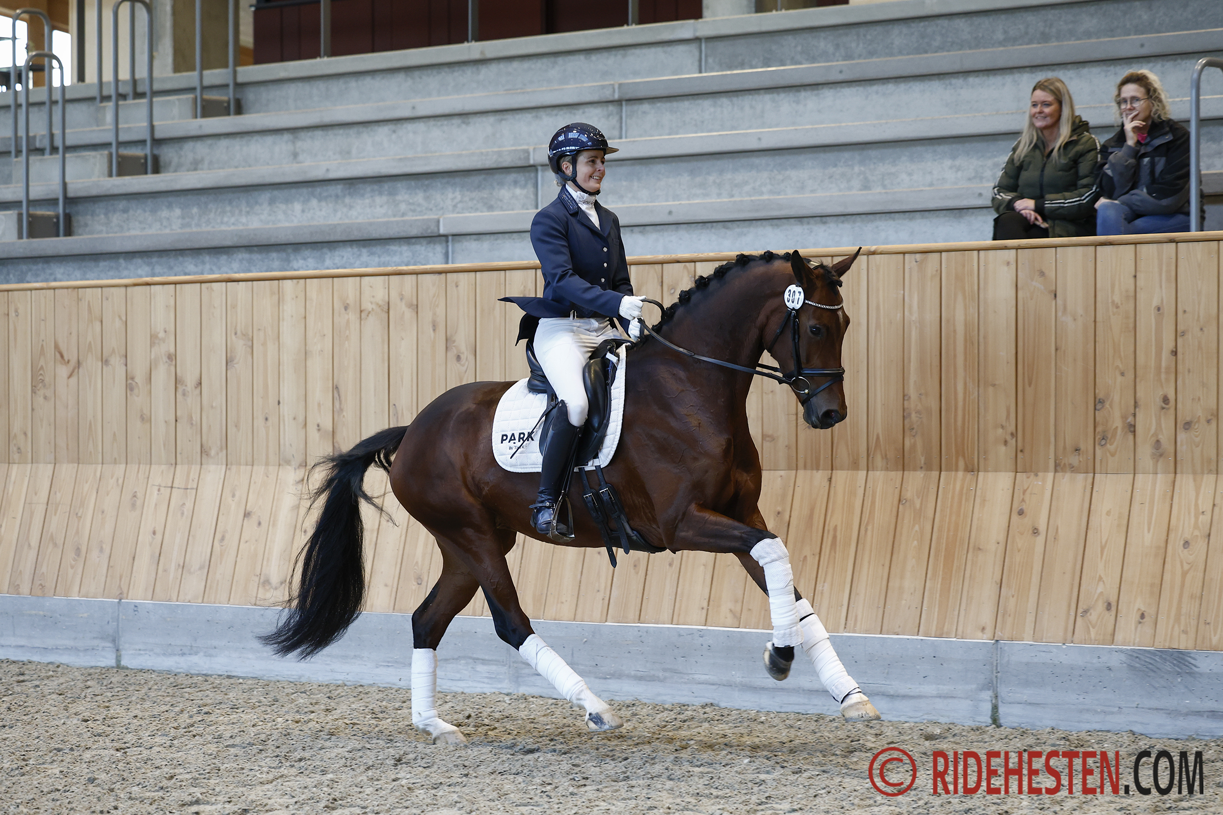 Feverfew e. Blue Hors Monte Carlo T/Blue Hors Farrell opdrættet af Blue Hors og ejet af Tina Kirkegaard, der selv red hesten, som fik 8,5 i skridt, ridelighed og kapacitet. Foto: Ridehesten.com