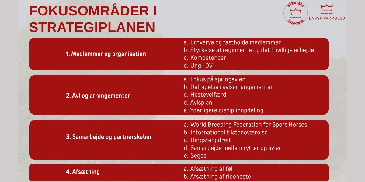 Dansk Varmblods første strategiplan så dagens lys i 2009. I dag arbejder forbundet med den tredje strategiplan 2024 – 2030. Det er Hovedbestyrelsen, som har udstukket rammerne for strategiplanen, som forbundets direktør Claus Hansen har præsenteret for regionerne ved medlemsmøder rundt om i landet.